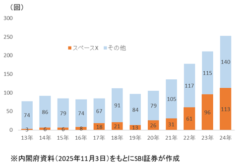 2025年については内閣府によるデータがないため同じ基準にはなりませんが、宇宙関連サイト「Sorae」の集計では329回(軌道到達は321回)とされ、2024年との比較で約3割の増加となっています。