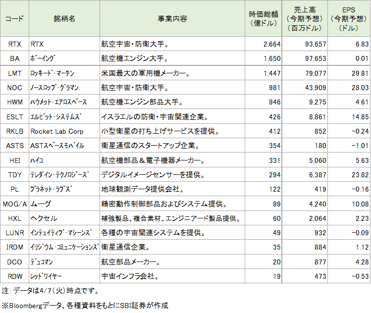 まず、S&P500指数の「航空・宇宙防衛」のサブセクターに属する銘柄から、宇宙関連事業の比率が相対的に高そうなものを5銘柄(時価総額の上位5銘柄に相当します)選びました。