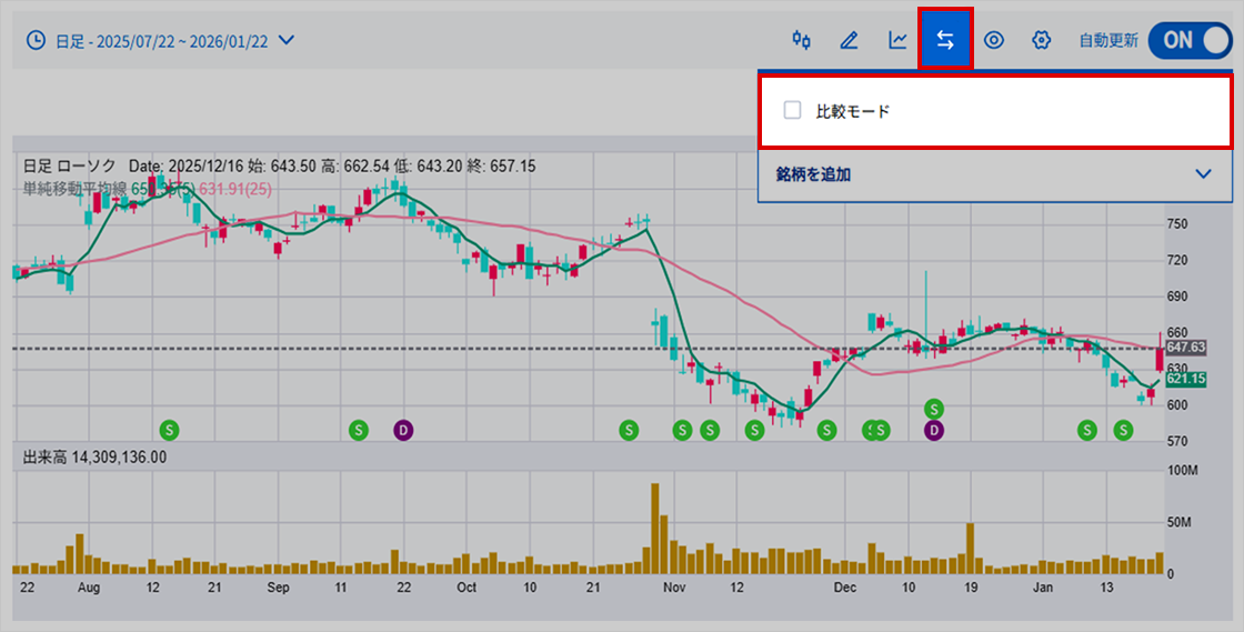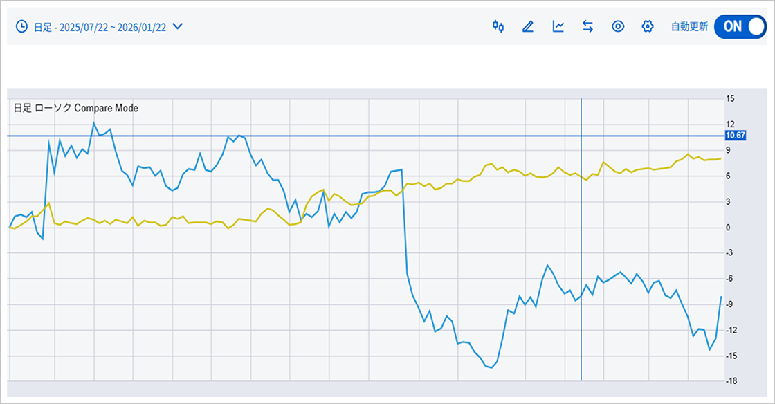 比較チャートでは、このように相関性の変化やズレが視覚的に捉えられるため、「今は個別銘柄が市場に対して強いのか・弱いのか」を判断するのに役立ちます。特に、同じ方向に動いているようで少しズレがある場合や、急に逆方向に向かい始めたときには、どちらに勢いがあるか、どちらが影響を受けているのかといった分析につながります。