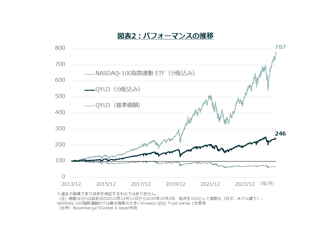 図表2はパフォーマンスの推移です。QYLDはカバード・コール戦略を用いて高い利回りの原資となる「オプション・プレミアム」を獲得する代わりに、NASDAQ-100指数の上昇に伴う利益を放棄します。そのためQYLDの分配込みリターンは、高いオプション・プレミアムを基に、設定来の2013年から2倍以上となっていますが、NASDAQ-100指数はそれ以上に大きな値上がりを実現しています。
