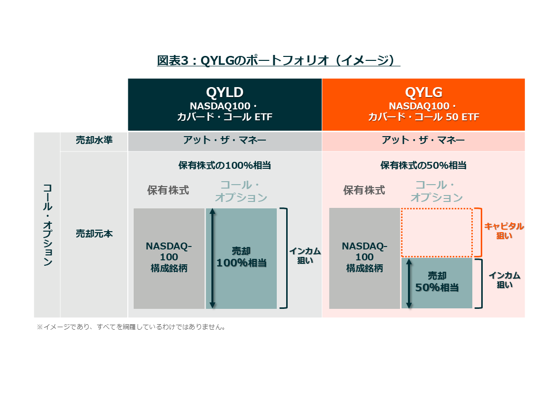 QYLGは、QYLDと同じくカバード・コール戦略を活用したETFですが、2つのETFはコール・オプションの売却量が異なります。QYLDは保有株式の元本に対して100%相当のコール・オプションを売却しますが、QYLGはその半分、つまり50%相当のコール・オプションを売却します。そのため、QYLGは残りの50%でNASDAQ-100指数のキャピタルも狙うことができるようになるのです。