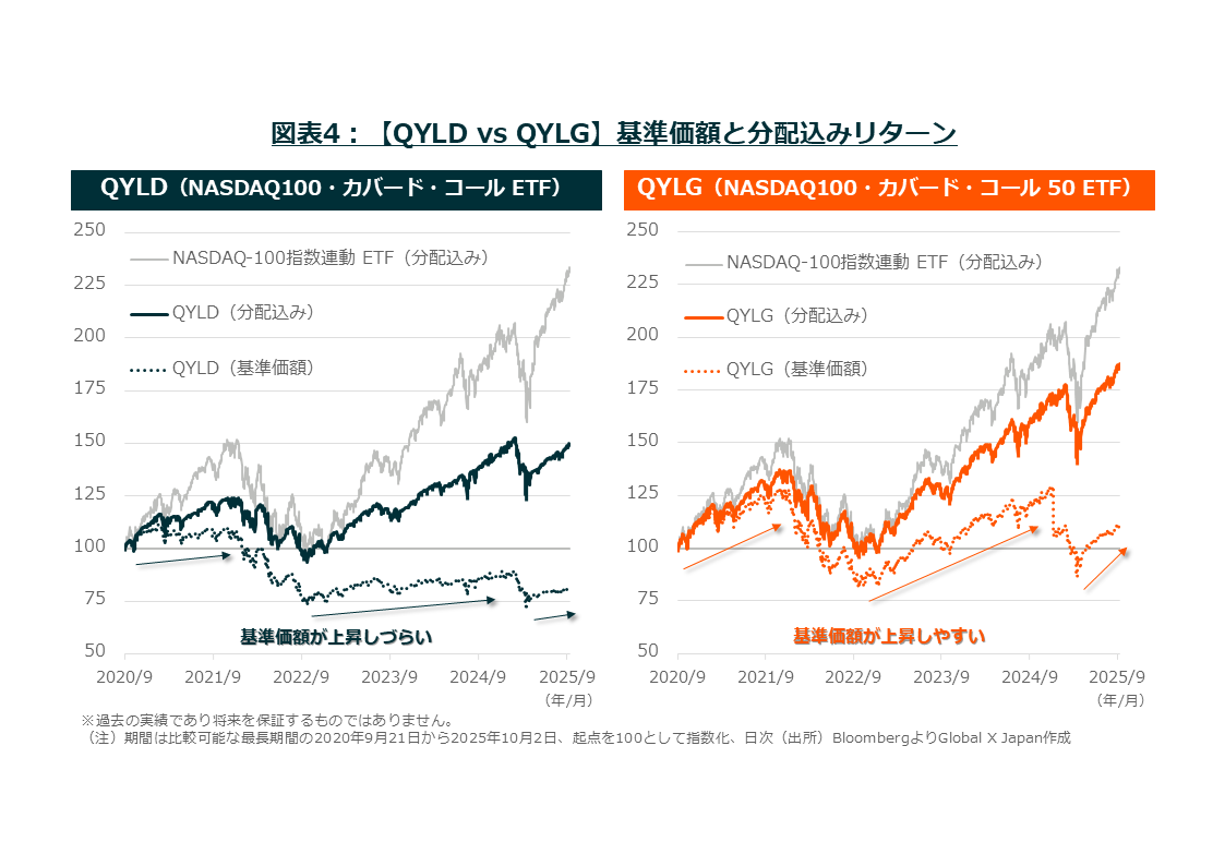 図表4は基準価額と分配込みリターンを比較したものです。左側のQYLDは、点線の基準価額が灰色のNASDAQ-100指数が上昇してもあまり上がりませんでした。一方、右側のQYLGは、NASDAQ-100指数の上昇局面で点線の基準価額がQYLDと比較して相対的に上昇しやすいことが見て取れます。