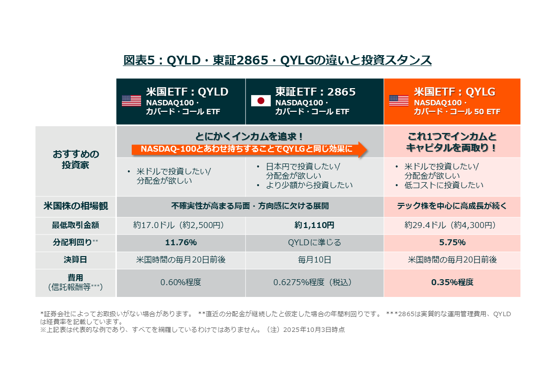 また、米国株に対する相場観からこれらETFを使い分けるのも効果的です。不確実性の高まった局面や方向感の欠ける展開は獲得プレミアムが大きくなるので、QYLDまたは2865が良いでしょう。一方で、テック株を中心に力強い上昇が続くと想定される場合は、キャピタルも狙えるQYLGが良いでしょう。そのほか、最低取引金額や分配利回り、決算日、費用の違いも表にまとめていますのでご参照ください。