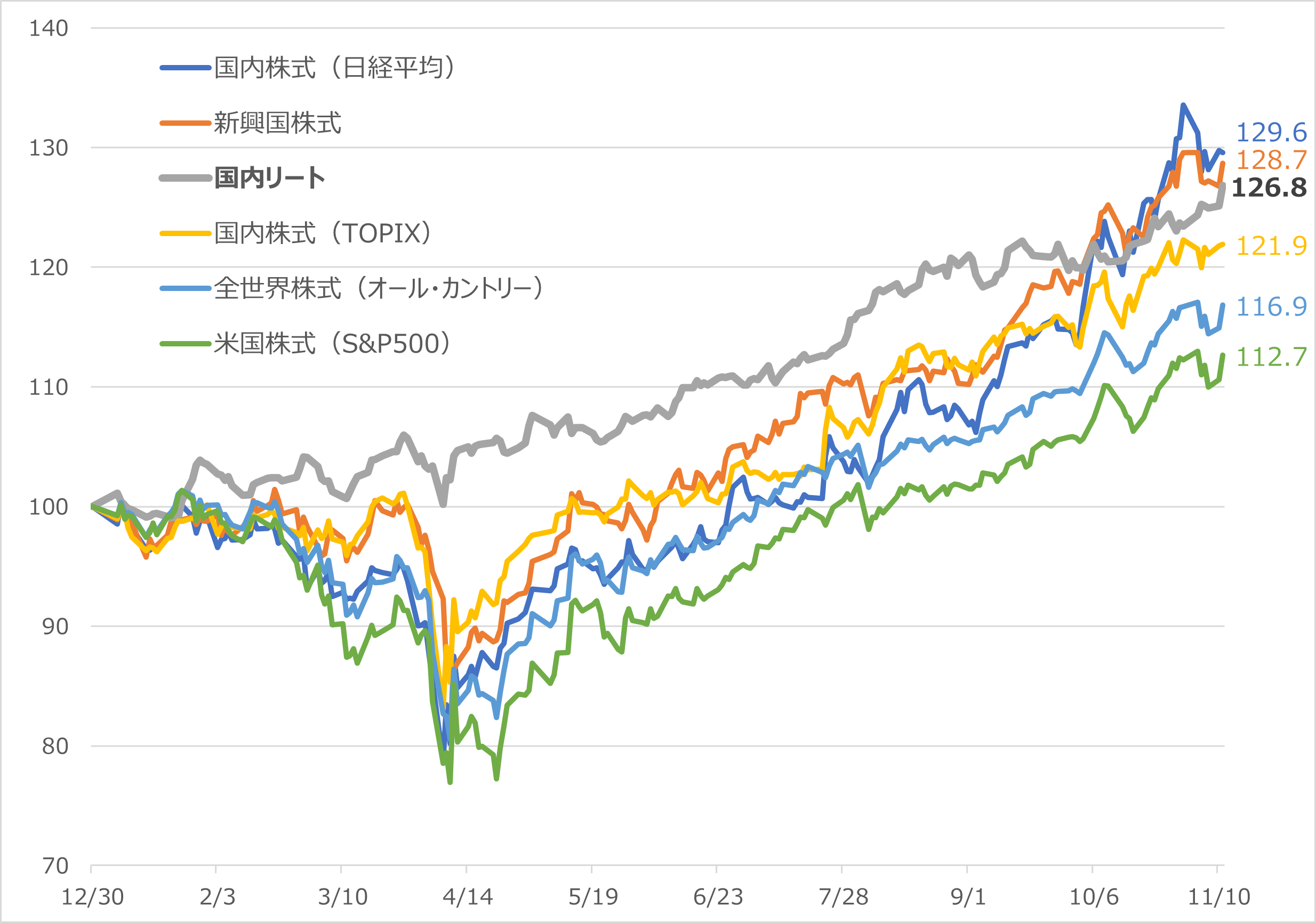 なお、国内リートについては、上場銘柄が58銘柄で時価総額合計が17.4兆円(11/11時点)という小さい市場のため、流動性に乏しく、価格変動が一方通行になりやすい点に留意が必要です。