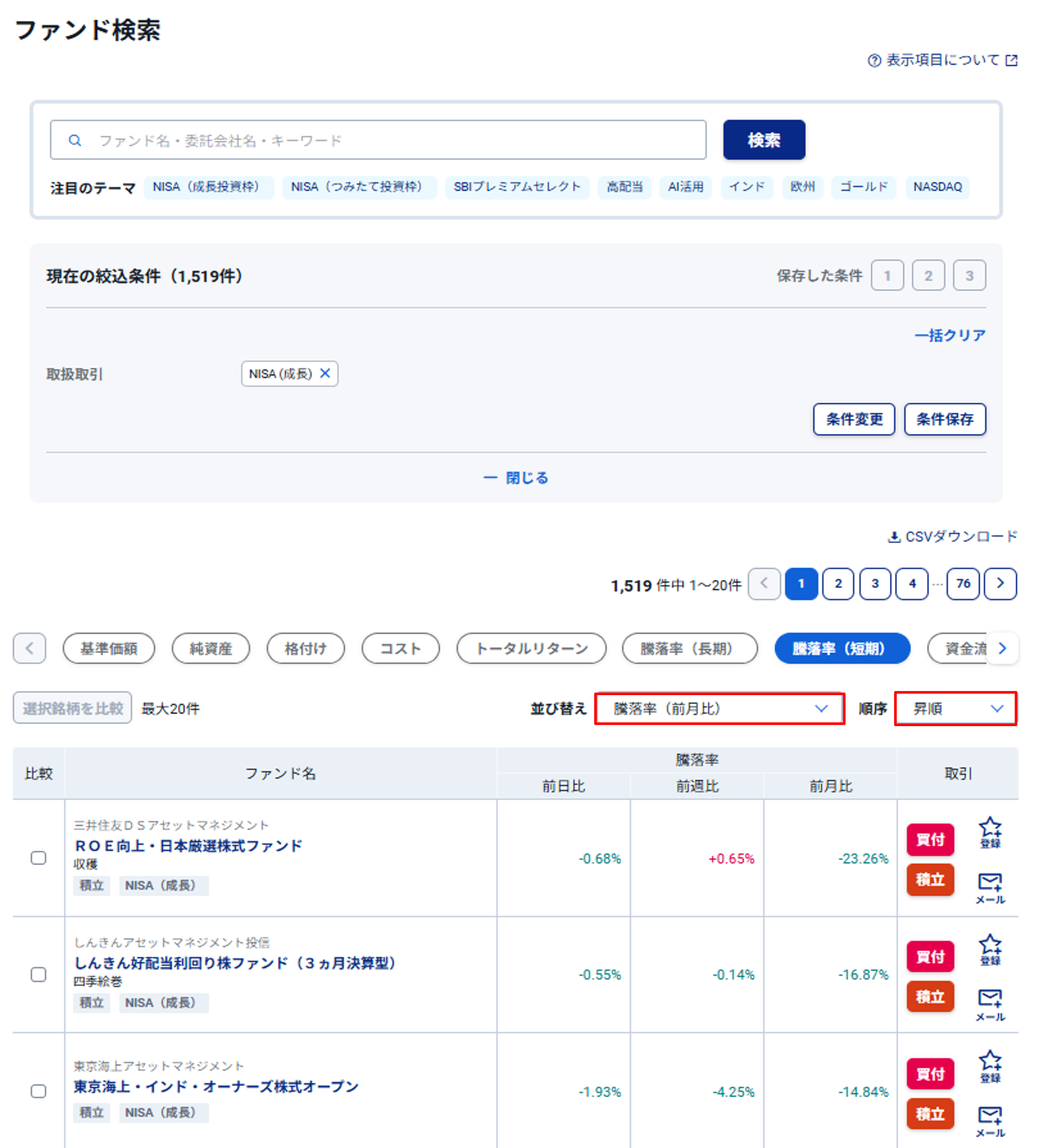 図表1 ファンド検索 NISA(成長投資枠) 騰落率(前月比) 昇順の表示方法
