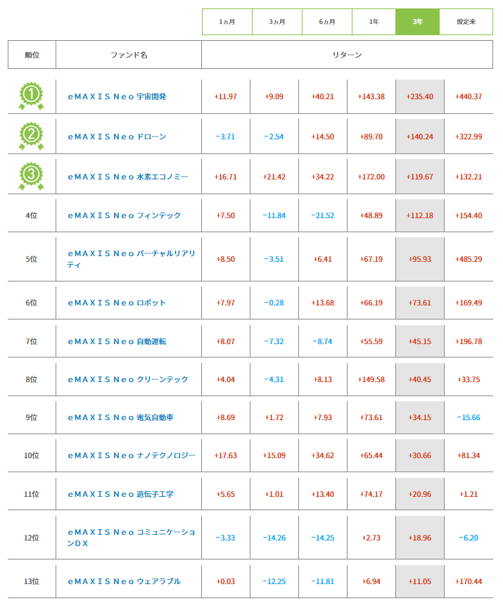 - ※eMAXIS Neo AIテクノロジーは運用期間3年未満のためランキングから除外