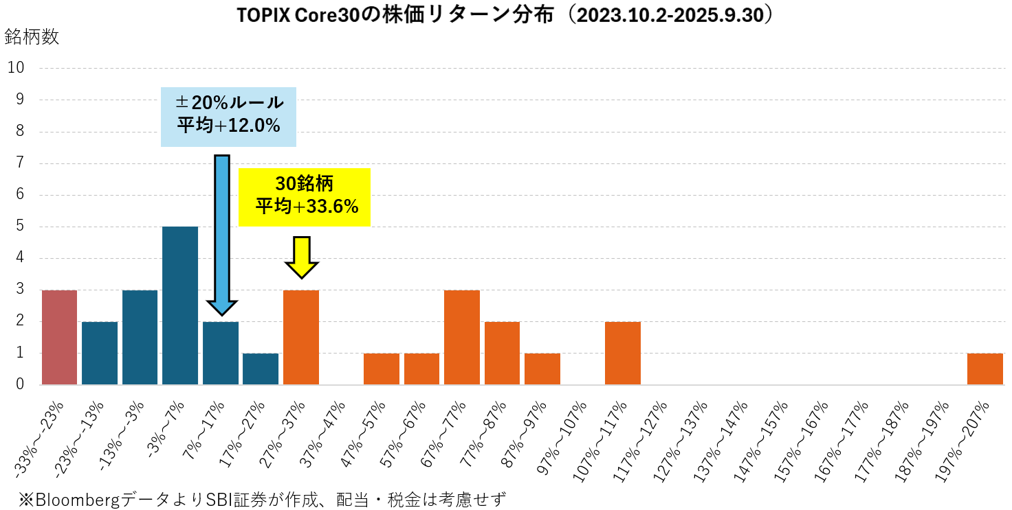 まず、TOPIX Core30の構成銘柄の騰落率の単純平均は、2年間で+33.6%でした(黄色矢印の位置)。悪くない数字です。この間のTOPIX自体の変化率は+35.6%だったので、この数字は概ね市場全体のパフォーマンスに近いものだったと言えるでしょう(計測期間初日から末日までの株価変化率、期中の銘柄入れ替え、配当・税金は考慮せず)。