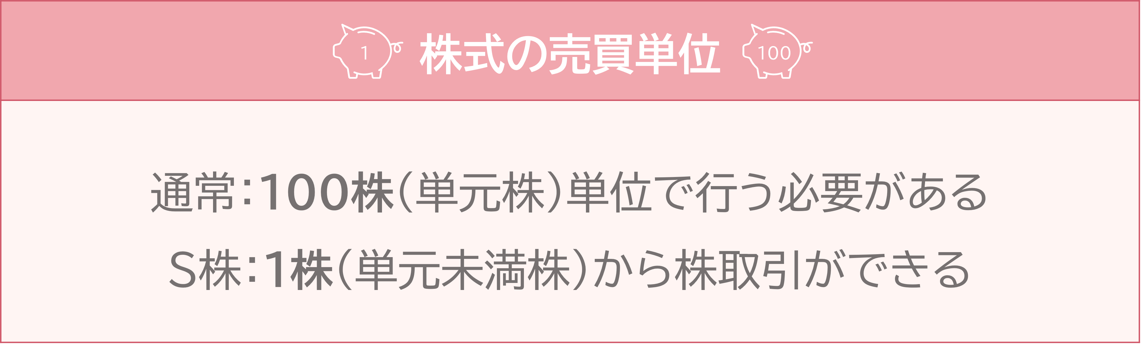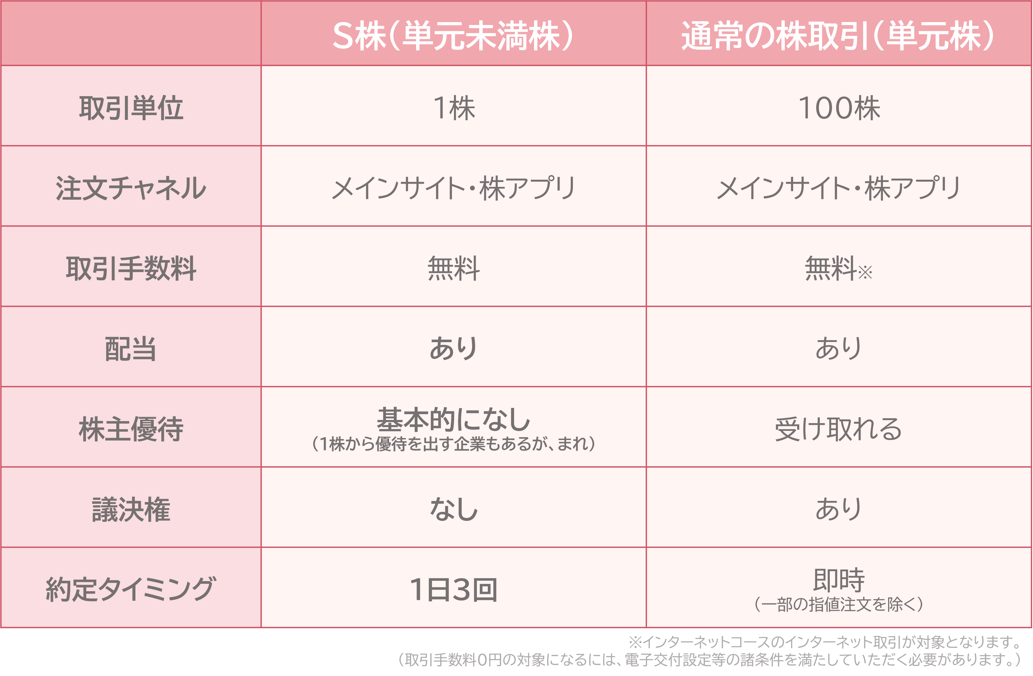 S株は通常の株式取引(単元株)と共通する点もある一方で、いくつか異なる点もあります。