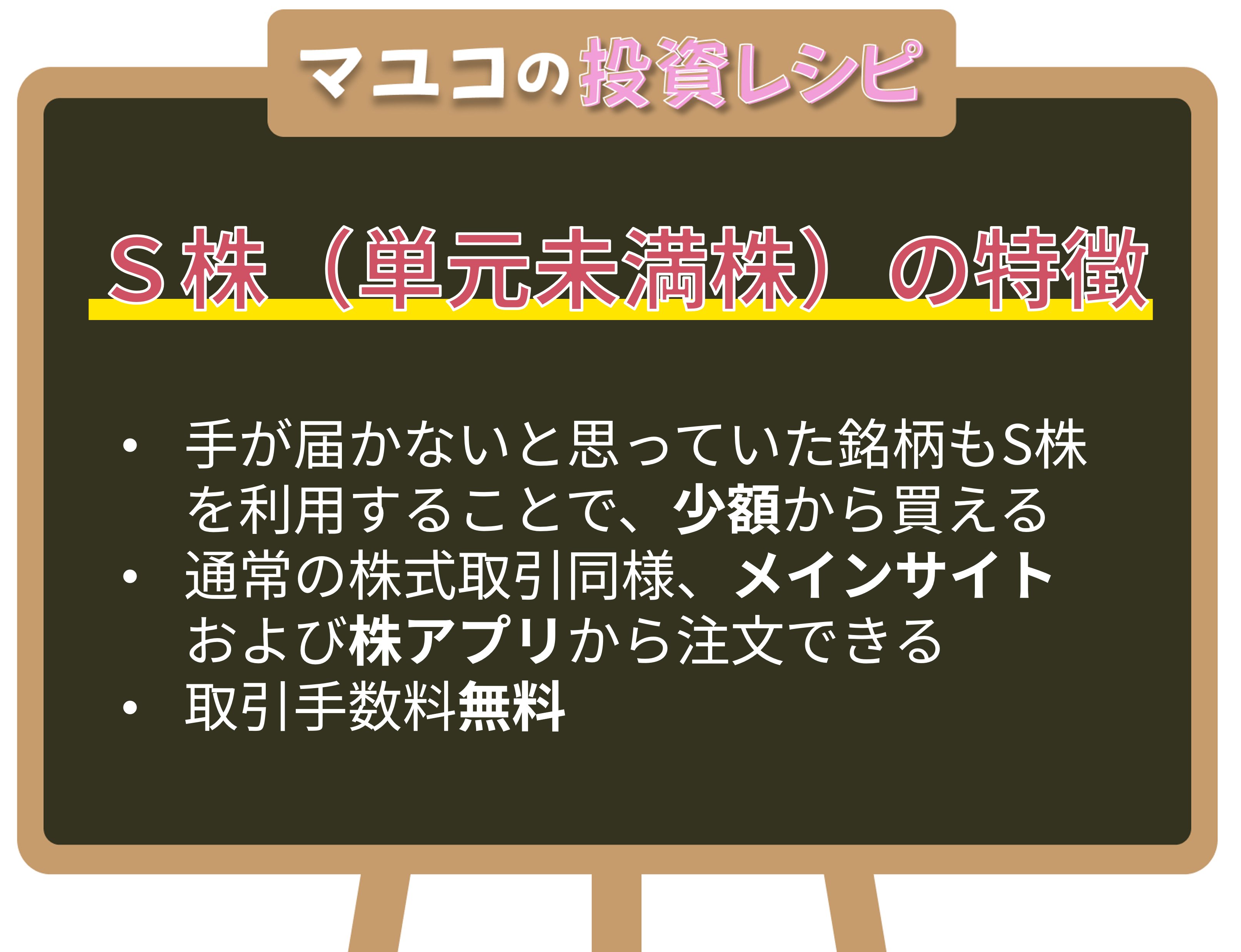 S株は、100株ではなく1株から株式取引ができるサービスとなっています。