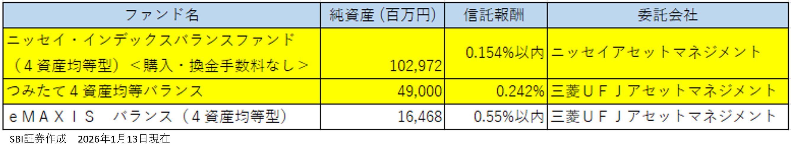 図表3:(ご参考)SBI証券で取り扱いのある4資産均等型の投資信託