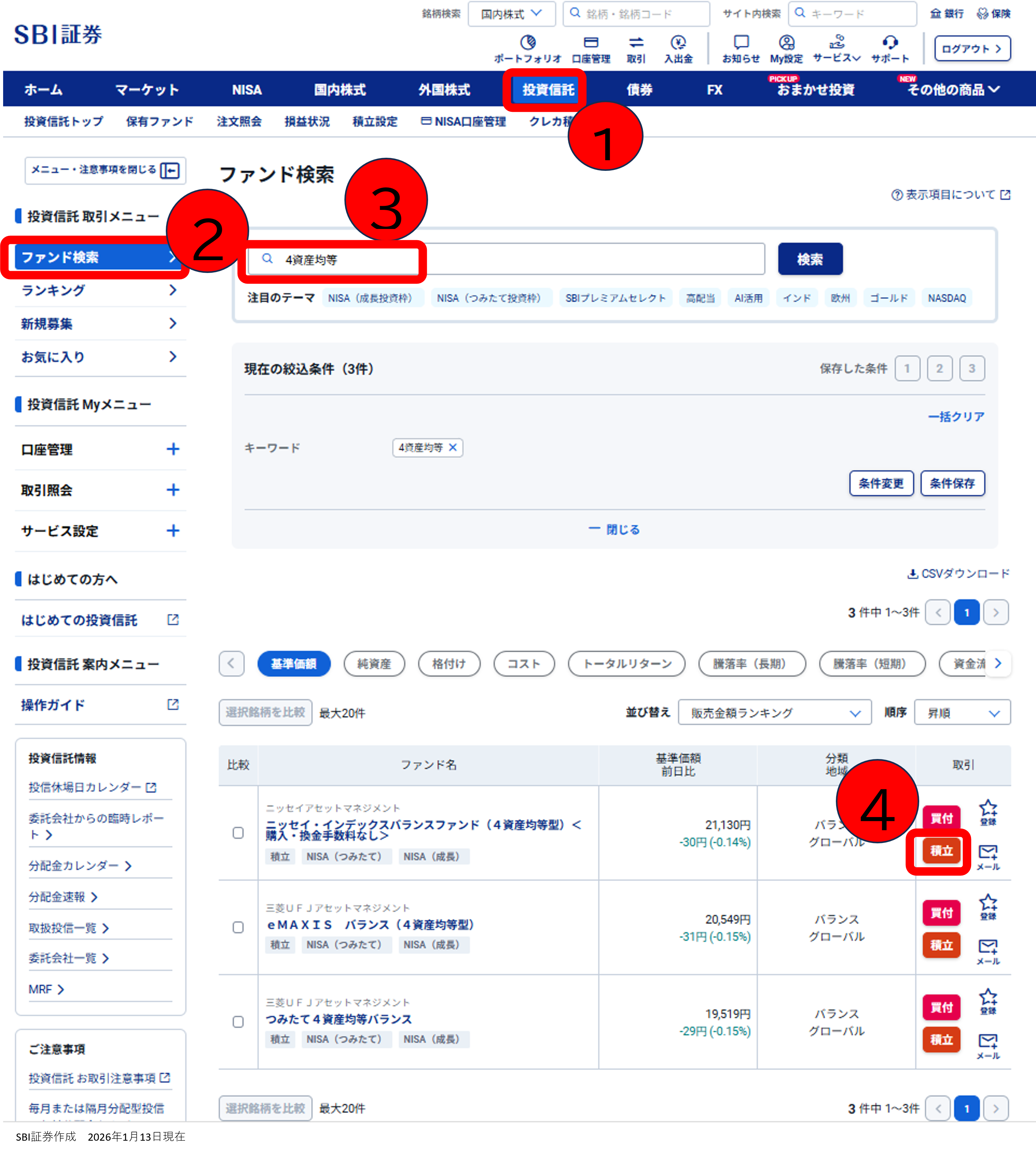 SBI証券トップ→ ①投資信託→ ②ファンド検索→ ③検索エンジンに「4資産均等」を入力