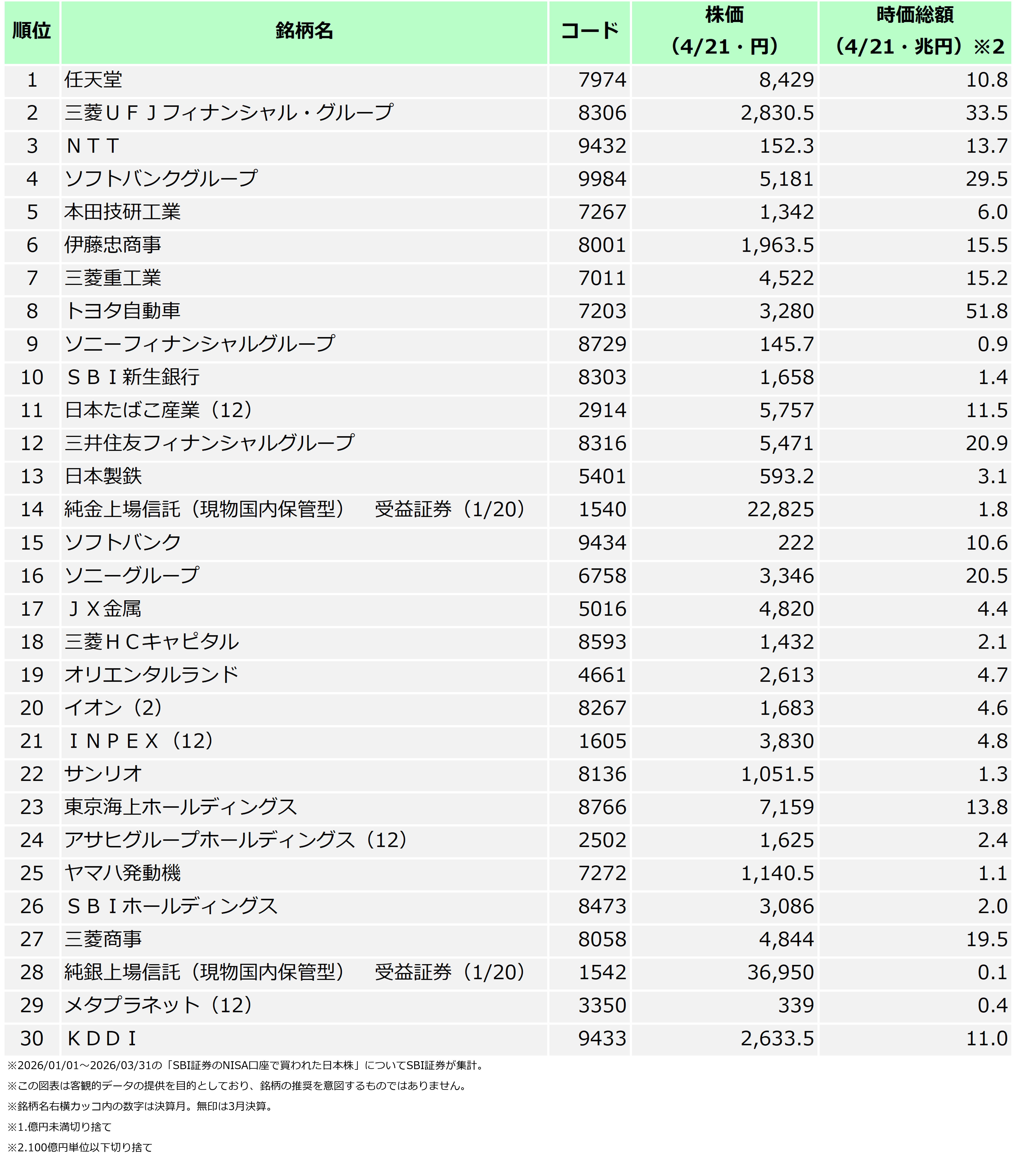 2026年1〜3月にSBI証券のNISA口座で買われた日本株TOP30