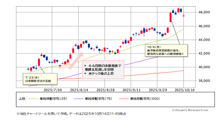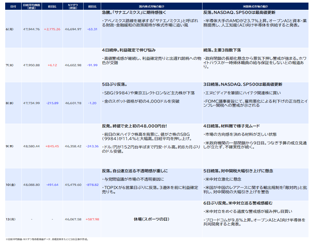 ①週初の急騰:10/6(月)の日経平均は2,175円26銭高(+4.75%)と大幅上昇。自民党総裁選に高市氏が当選し、積極財政に期待