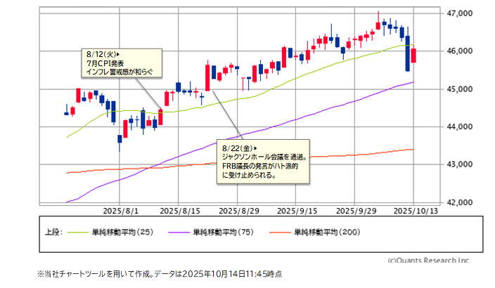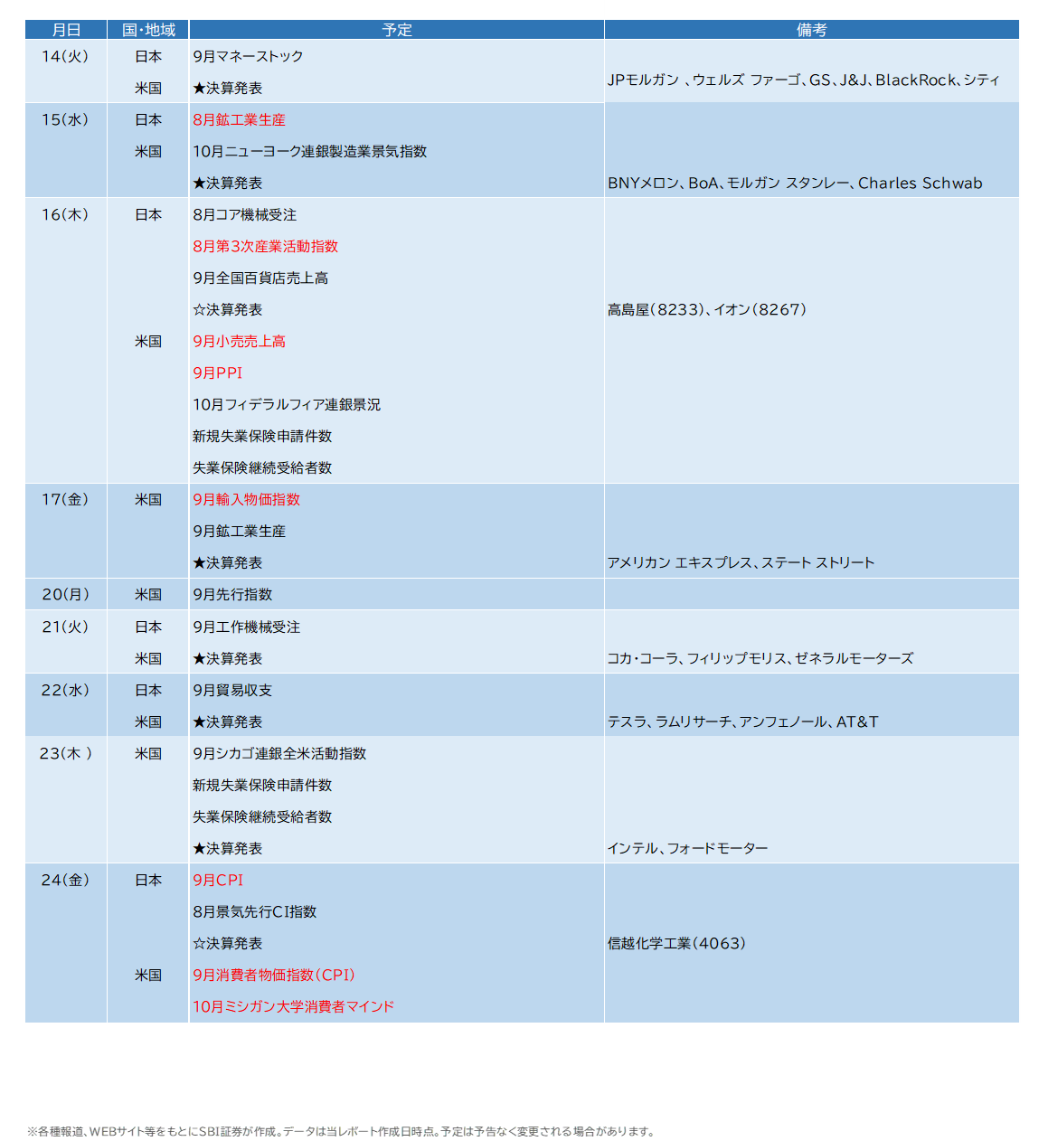 先週の米国株式市場は、トランプ大統領が中国に追加関税をかけると表明したことがネガティブサプライズとなって10/10(金)に急落しました。今週の株価材料として、大手銀行の7-9月期決算発表、トランプ大統領の発言、政府閉鎖の動向が注目されます。