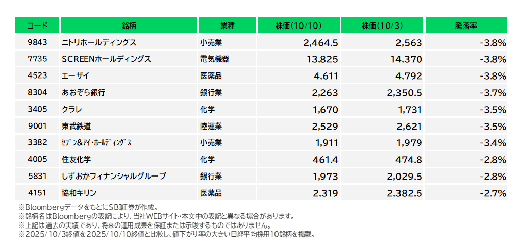 図表8 日経平均株価採用銘柄の騰落率下位(10/3~10/10)