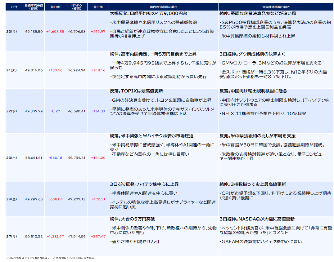 ・日経平均株価10/24(金)終値は49,299円65銭で、前週末比1,717円50銭(3.6%)の大幅上昇。