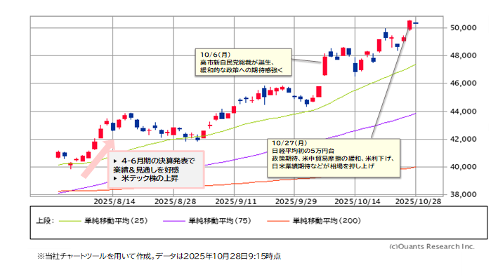 10/27(月)の日経平均株価の終値は史上初めて5万円の大台に乗せました。