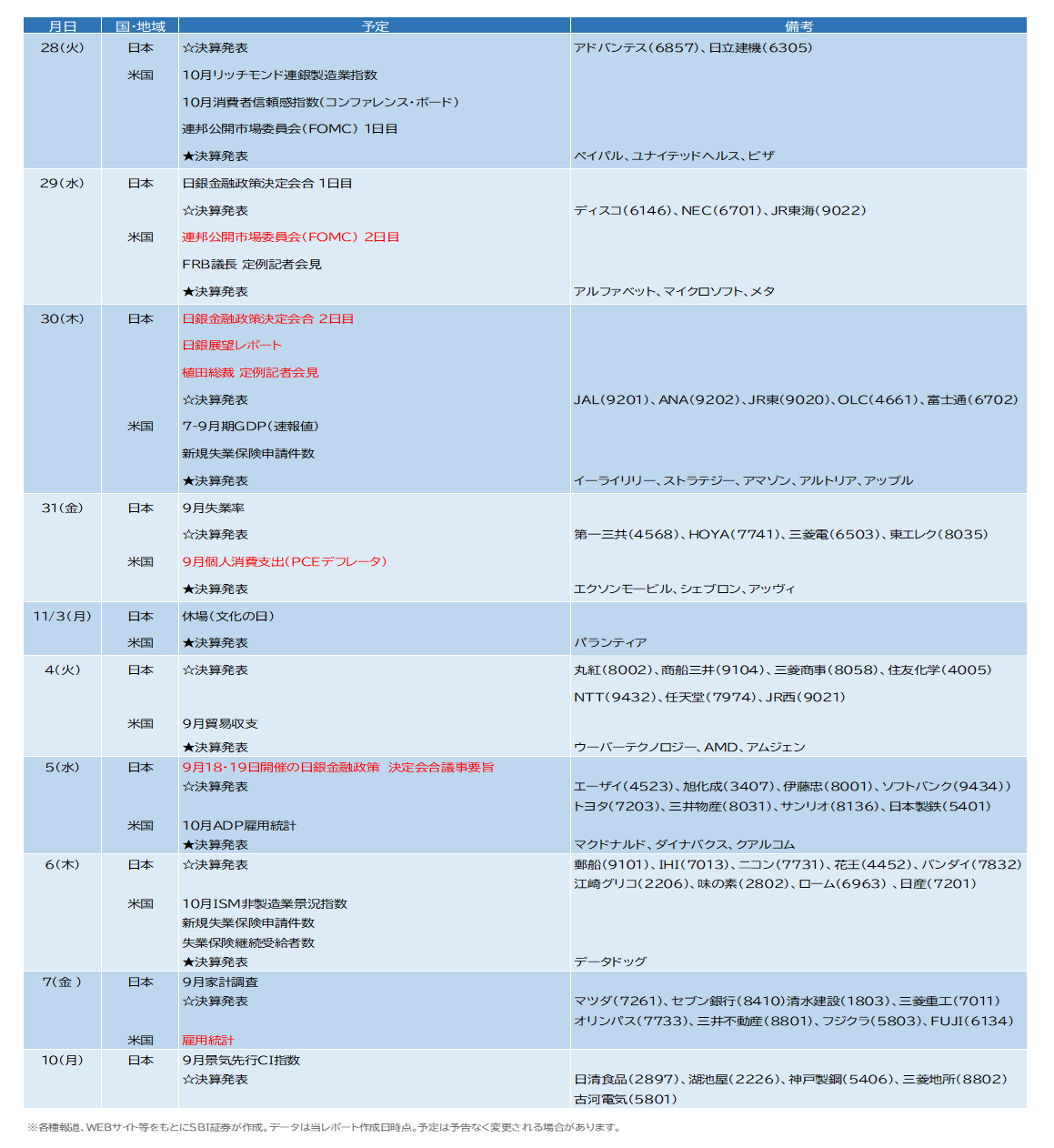 ・GAFAM5社決算発表29日(水)~30日(木):AI・クラウド・広告収益の動向が強気相場継続の鍵を握るため、テック株の動向が市場全体のセンチメントを左右する展開が予想されます。