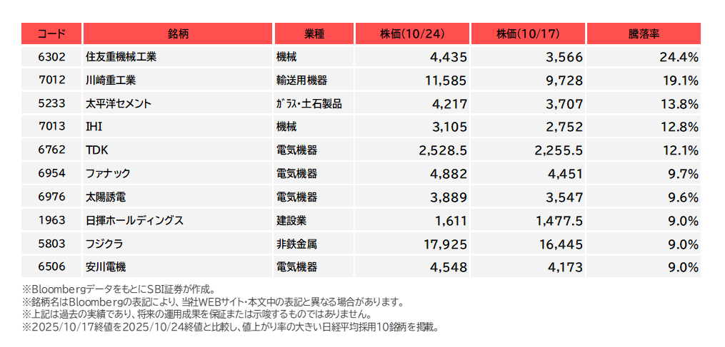 図表7 日経平均株価採用銘柄の騰落率上位(10/17~10/24)