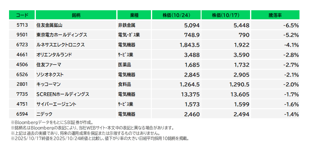 図表8 日経平均株価採用銘柄の騰落率下位(10/17~10/24)