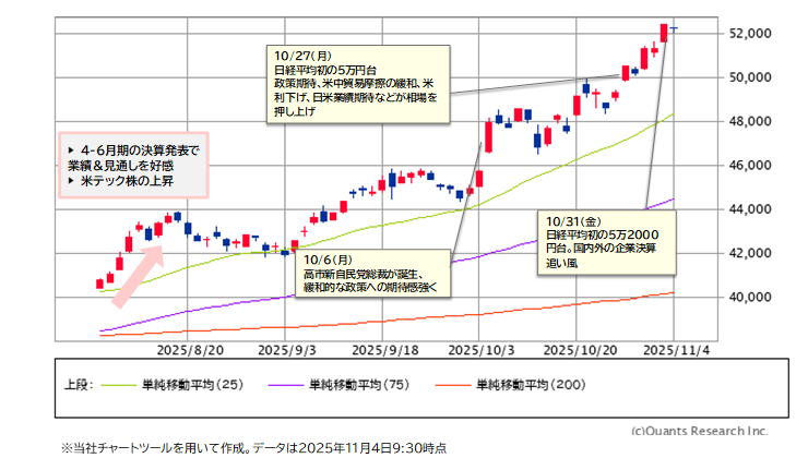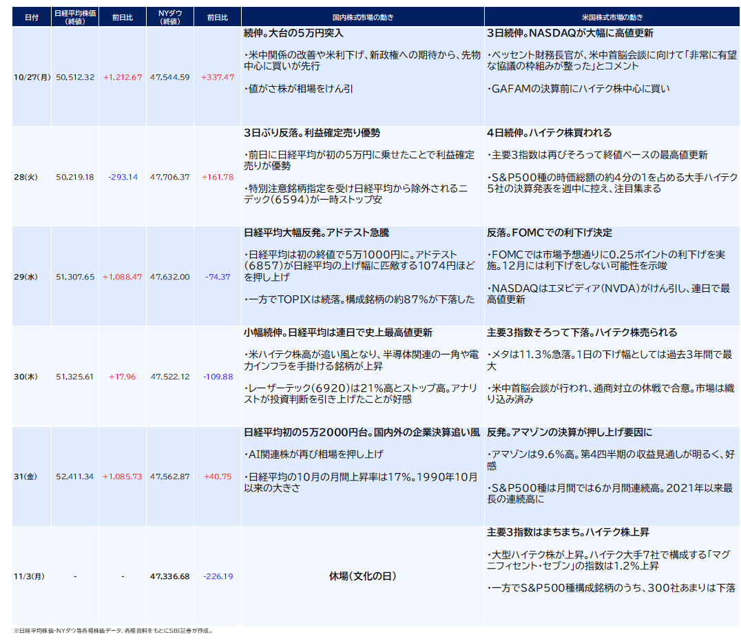 ・日経平均株価10/31(金)終値は52,411円34銭で、前週末比3,111円69銭(+5.94%)の大幅上昇。