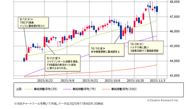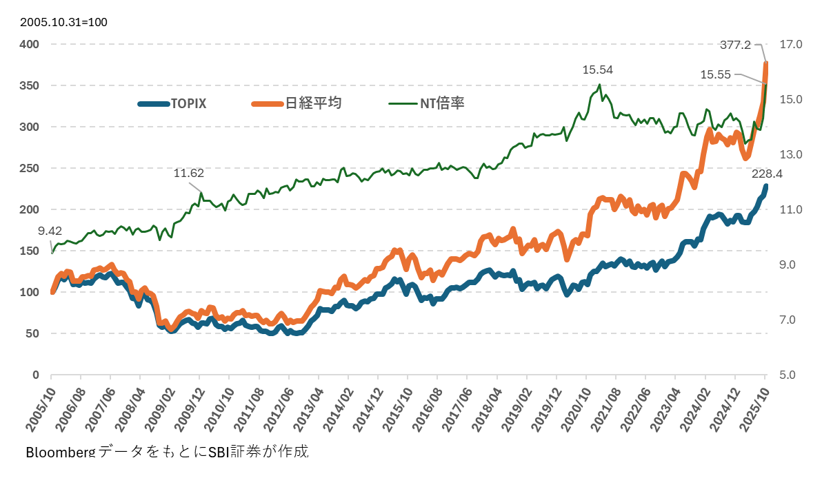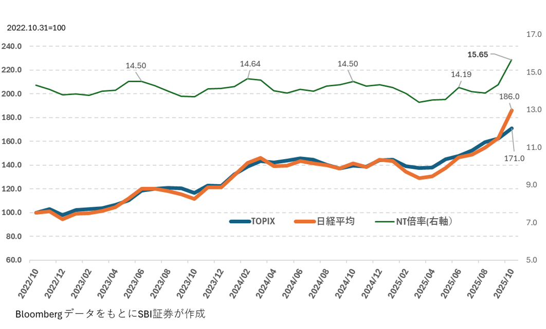 高市政権の発足後、支持率の高さと日米首脳会談の成功を背景に、日経平均株価は勢いよく続伸しています。一方、TOPIX(東証株価指数)も上昇してはいるものの、日経平均に比べるとやや出遅れ感が否めません。