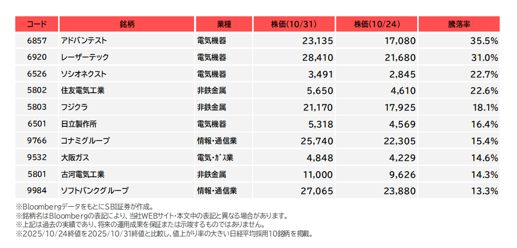図表7 日経平均株価採用銘柄の騰落率上位(10/24~10/31)