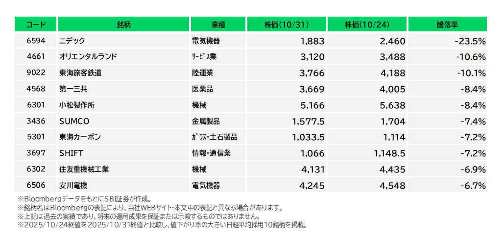 図表8 日経平均株価採用銘柄の騰落率下位(10/24~10/31)