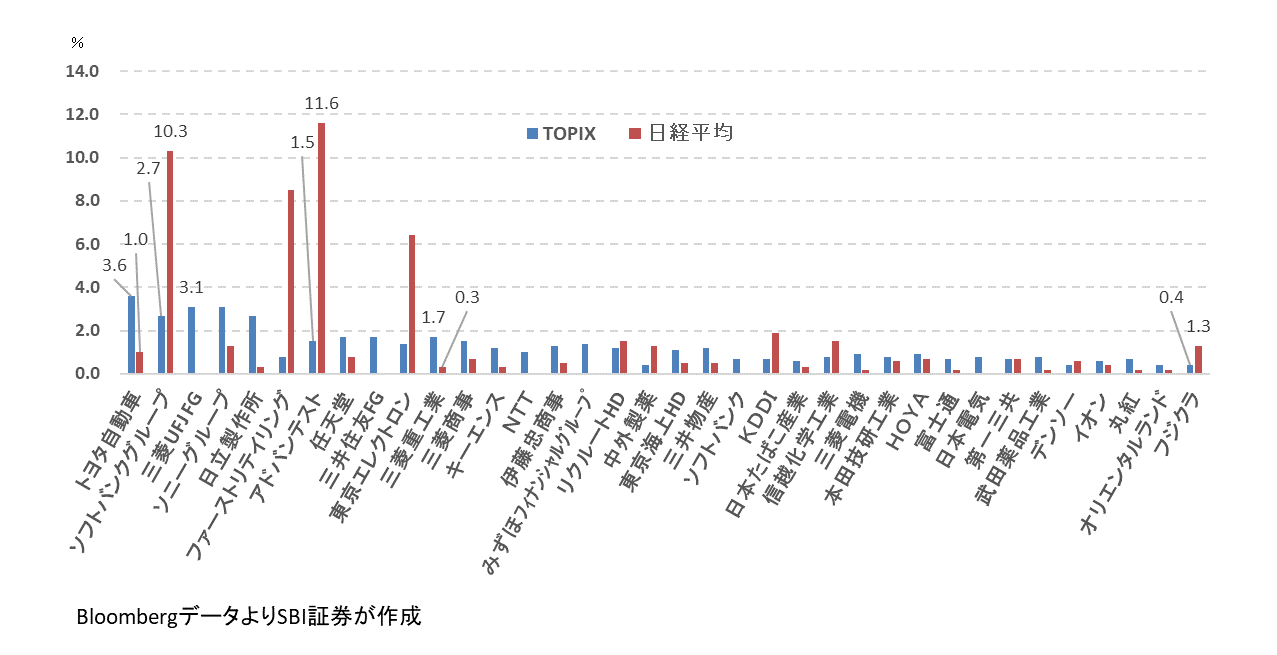 図表11 TOPIXと日経平均に占める構成比: 日経平均は「尖った」指数