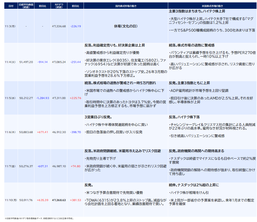 ②週中:米ハイテク株の調整や日経平均株価のテクニカル的な過熱感から、11/5(水)の日経平均は2,423円の急落で一時5万円割れとなりました。