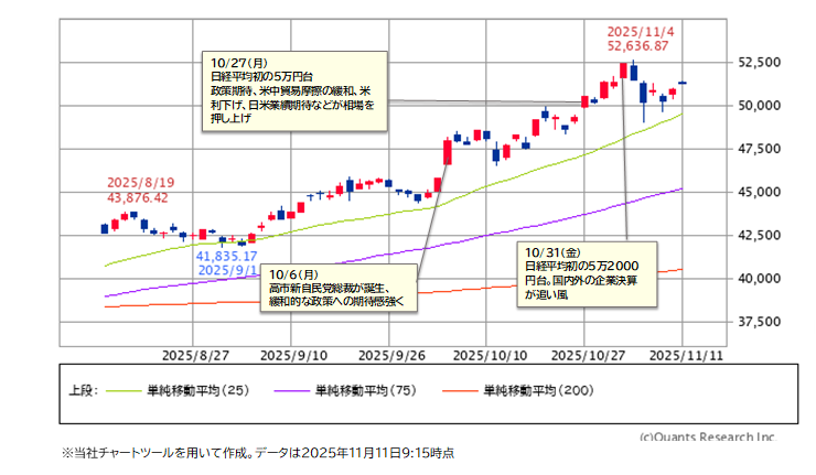 例えば、11月7日の日経平均株価は 50,276円、25日移動平均は 49,031円なので、強気相場と判断できます。