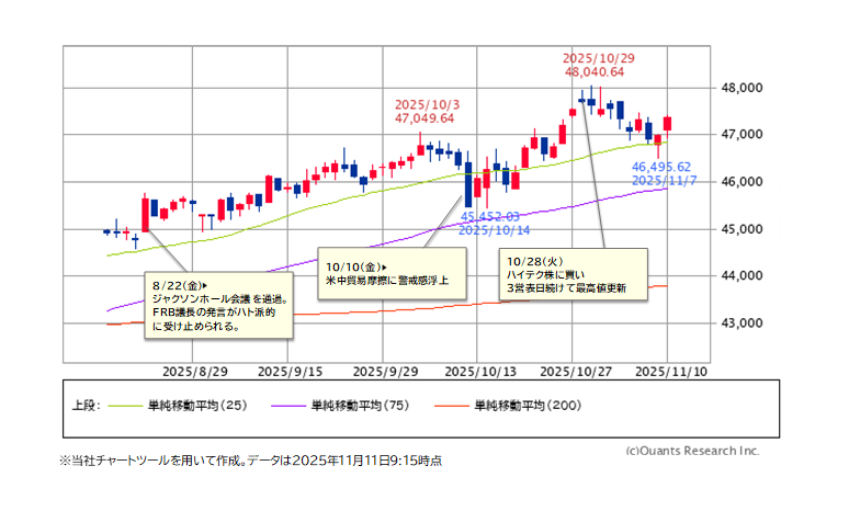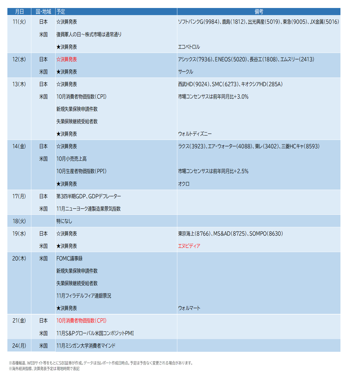 ①11/4(火):年初来高値を更新する場面もありましたが、過熱感から利益確定売りが優勢となり、終値は前週末比で反落しました。