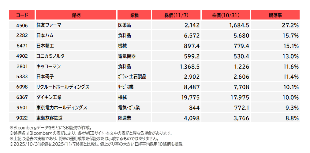 図表7 日経平均株価採用銘柄の騰落率上位(10/31~11/7)