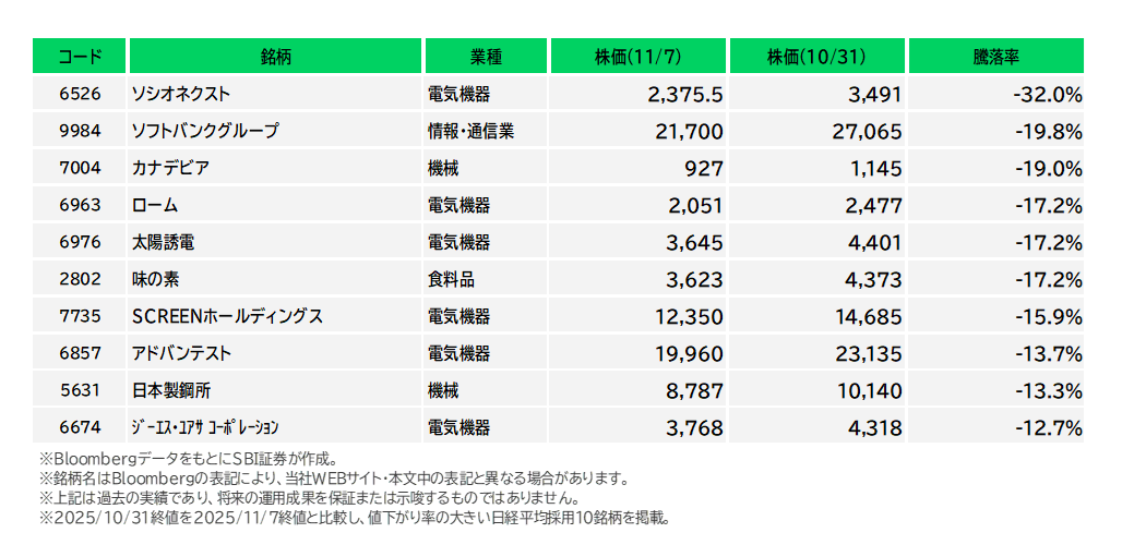 図表8 日経平均株価採用銘柄の騰落率下位(10/31~11/7)