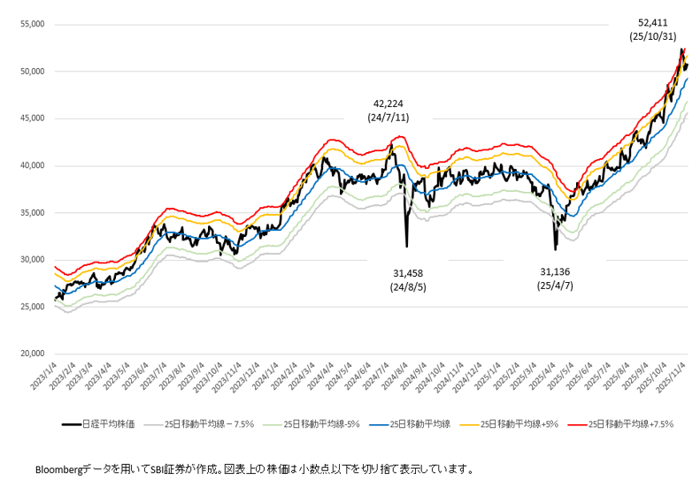 - 今年10月末には +8.9%上方乖離 → 直後に急落(10/31終値52,411円 → 11/5に一時49,073円まで下落)