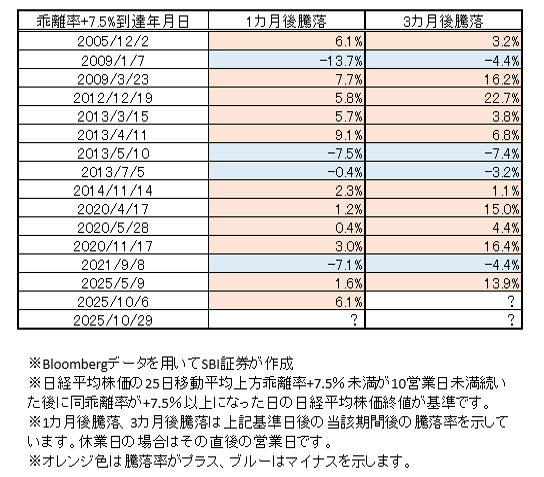 図表10では、日経平均株価の25日移動平均乖離率が「久しぶりに」+7.5%を超えた日を基準日とし、その1カ月後および3カ月後の騰落率を調べています。「久しぶり」とは、日経平均株価が25日移動平均線+7.5%未満で10営業日以上推移したことを意味します。