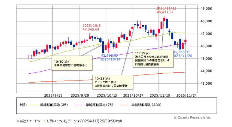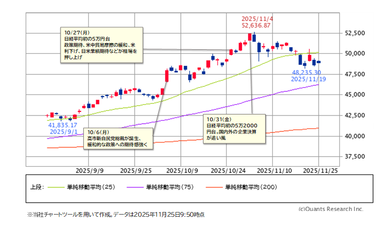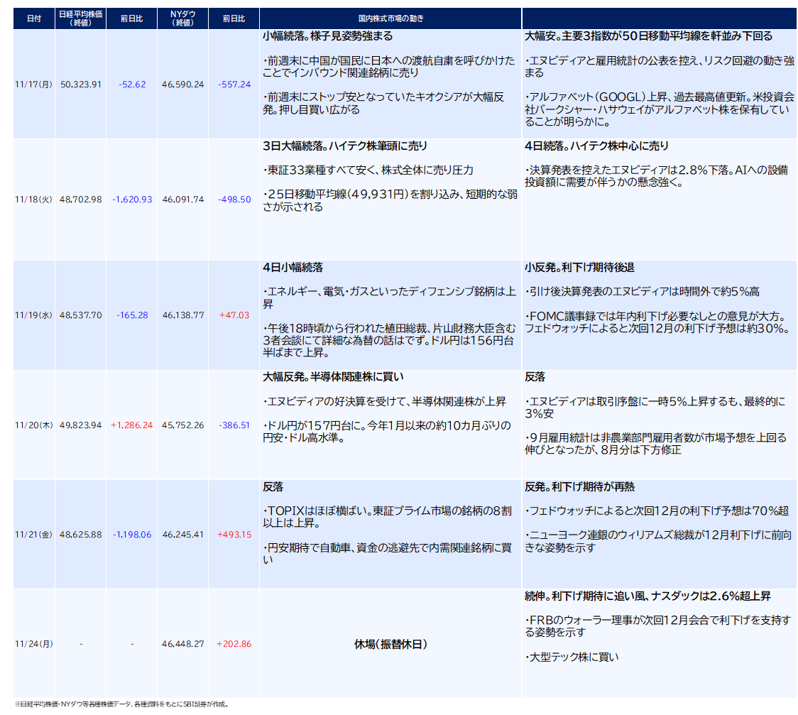 ・日経平均株価11/21(金)終値は48,625円88銭で、前週末比円1,750円65銭(約3.48%)の下落でした。