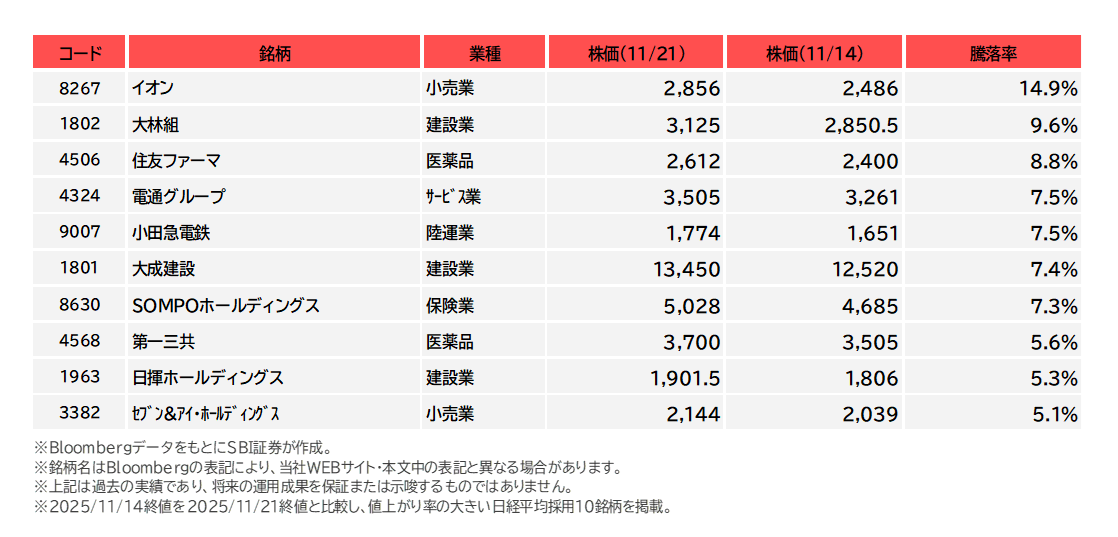 図表7 日経平均株価採用銘柄の騰落率上位(11/14~11/21)