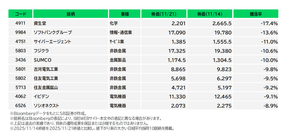 図表8 日経平均株価採用銘柄の騰落率下位(11/14~11/21)