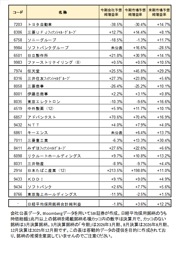 図表9では、日経平均採用銘柄のうち時価総額1兆円以上の企業について、今期・来期の予想純利益増減率を示しています。また、日経平均採用銘柄全体の純利益合計も掲載しています。