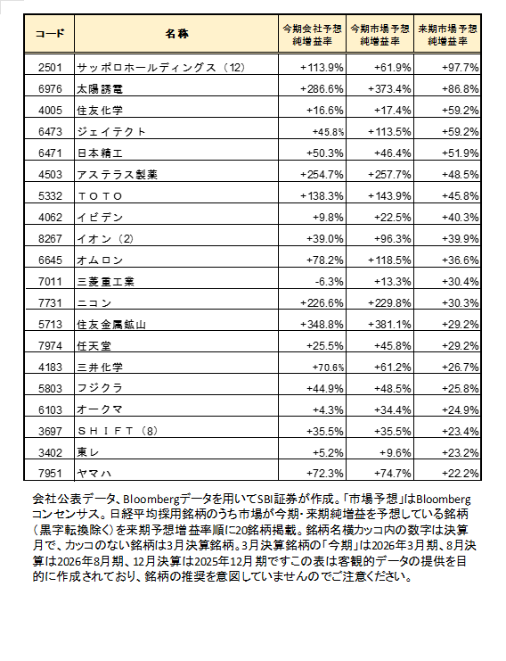 図表10は、市場で今期・来期に純利益の増加が予想される銘柄について、来期の増益率が大きい順に20銘柄を並べたものです。市場の関心が「来期」に移る過程で、これらの銘柄が投資家の注目を集める可能性があります。