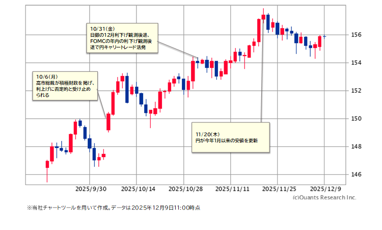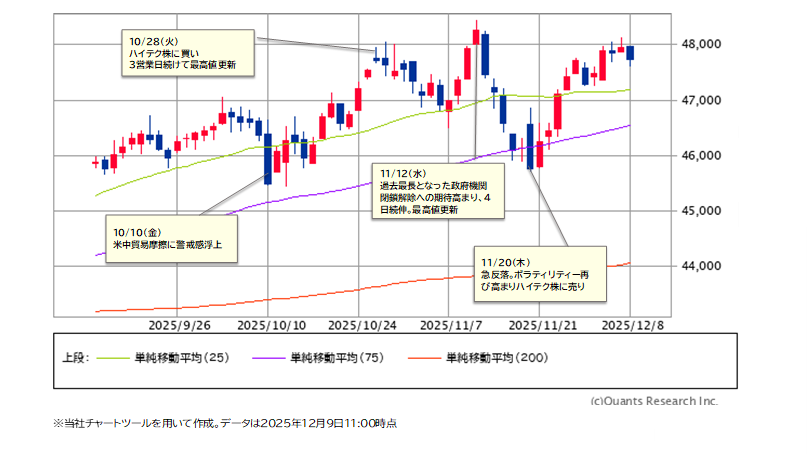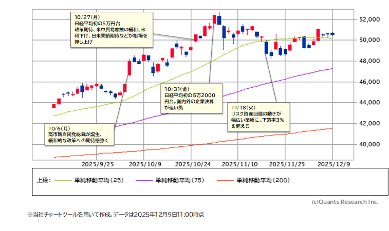 ②週中(12/2~12/4):米国における利下げとロボティクス関連の政策期待による株高が相場の追い風となりました。12/4には終値ベースで5万円台を回復しました。