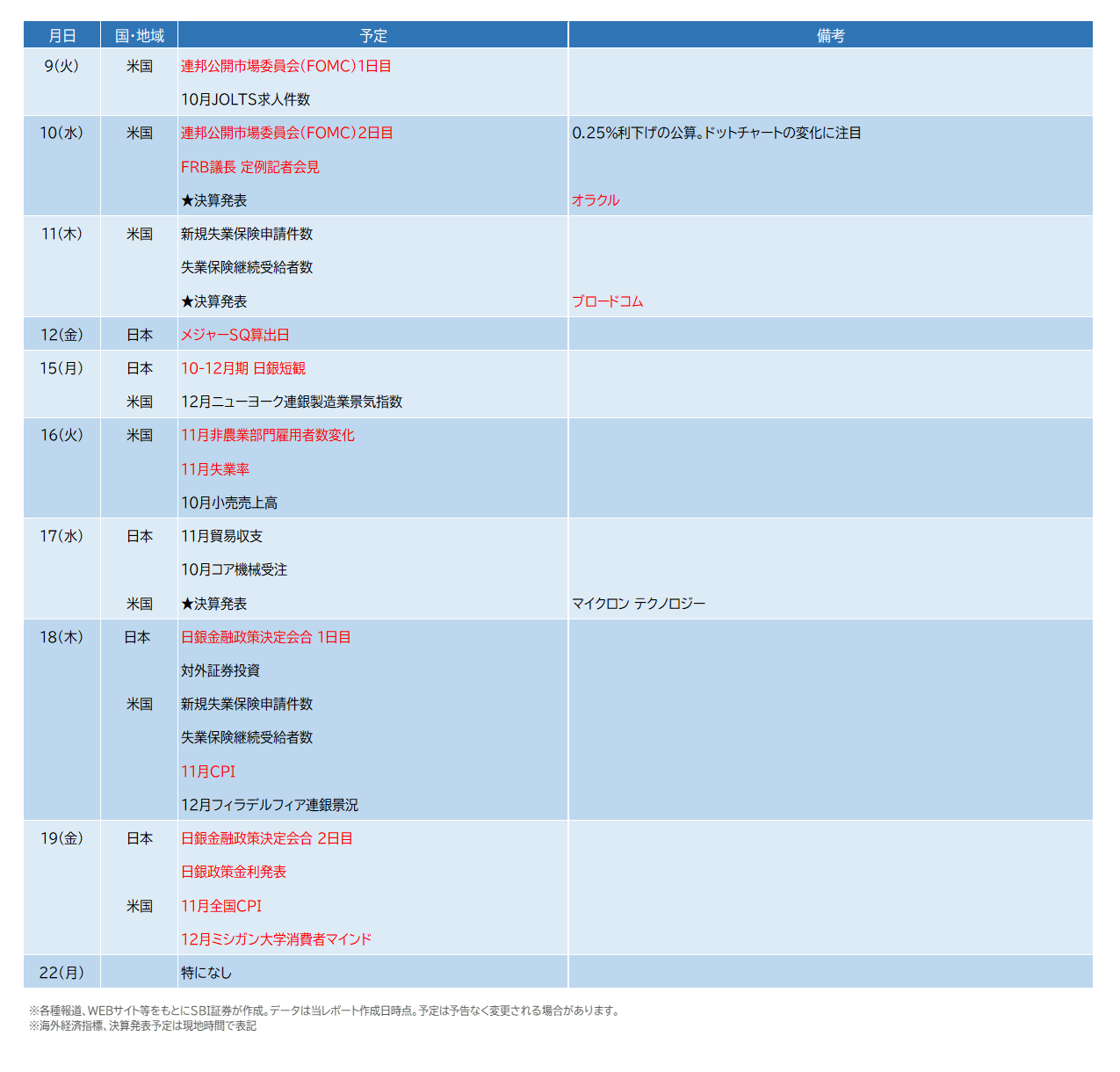 先週の米国株式市場は、年末商戦が堅調に推移していることに加え、ADP雇用統計が前月比マイナスとなって利下げ期待を強化して、強含みの展開となりました。今週の株価材料として、FOMC(連邦公開市場委員会)、オラクルとブロードコムの決算発表、米国...