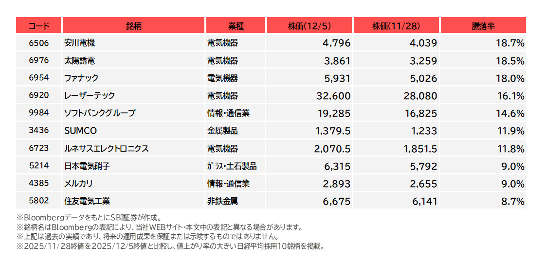 図表7 日経平均株価採用銘柄の騰落率上位(11/28~12/5)