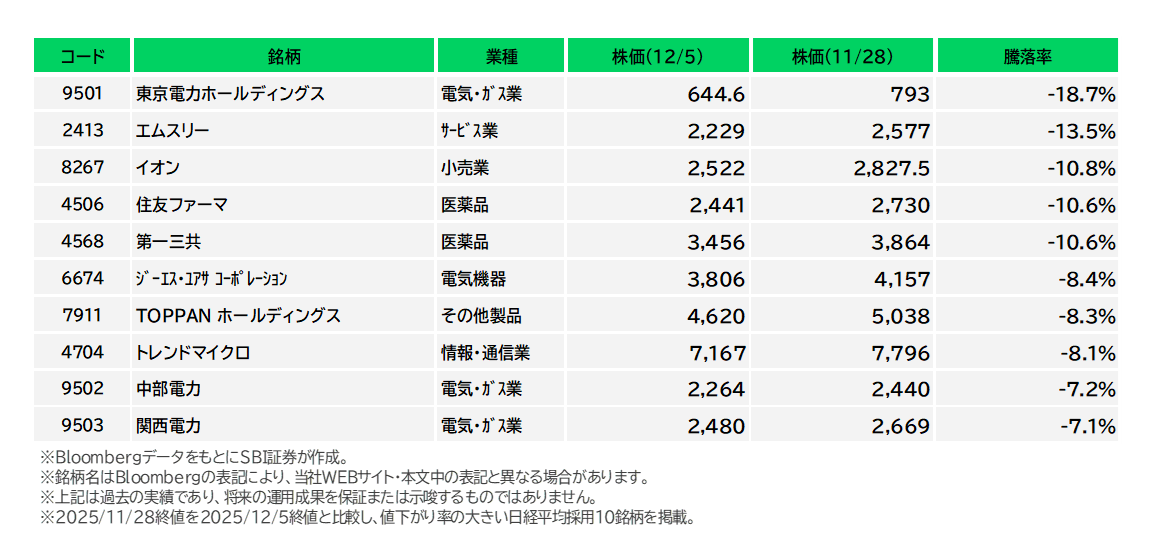 図表8 日経平均株価採用銘柄の騰落率下位(11/28~12/5)