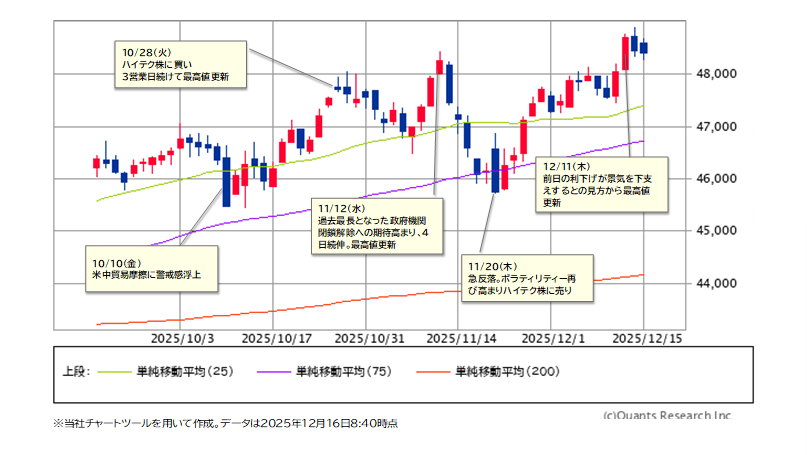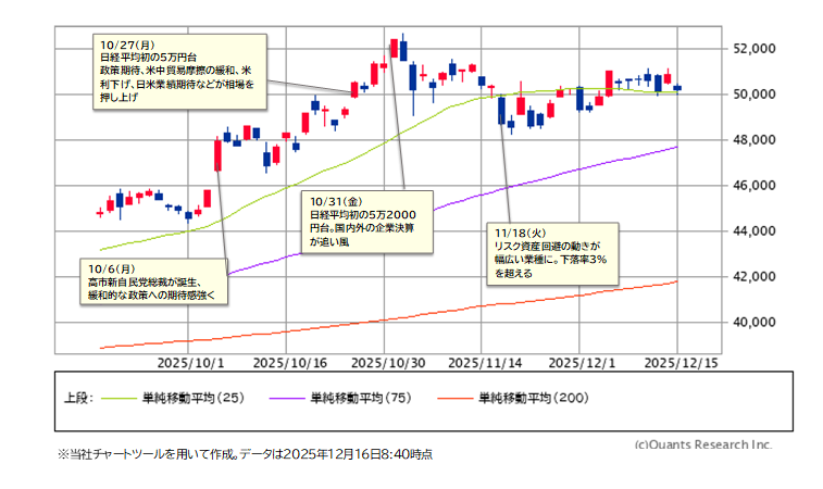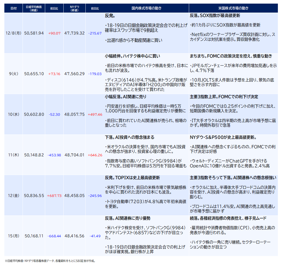 ②週中(12/10-11):米株市場にてAI投資への懸念が強まった影響で、日本でもAI関連株に売りが集まりました。11日には、日経平均株価は節目となる5万円を一時割り込む場面も。
