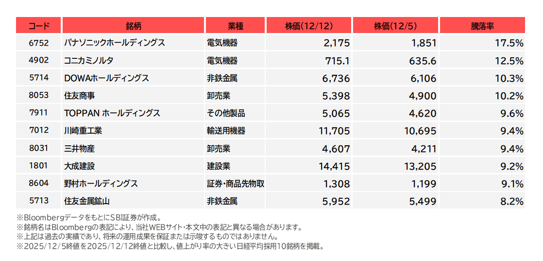 図表7 日経平均株価採用銘柄の騰落率上位(12/5-12/12)