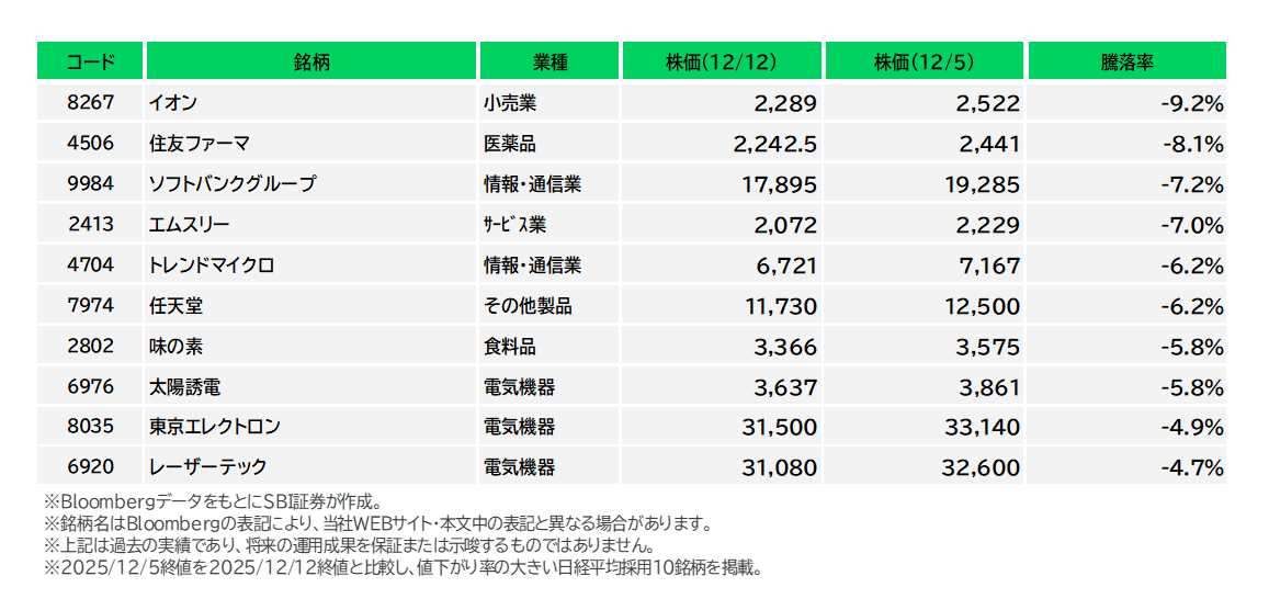 図表8 日経平均株価採用銘柄の騰落率下位(12/5-12/12)