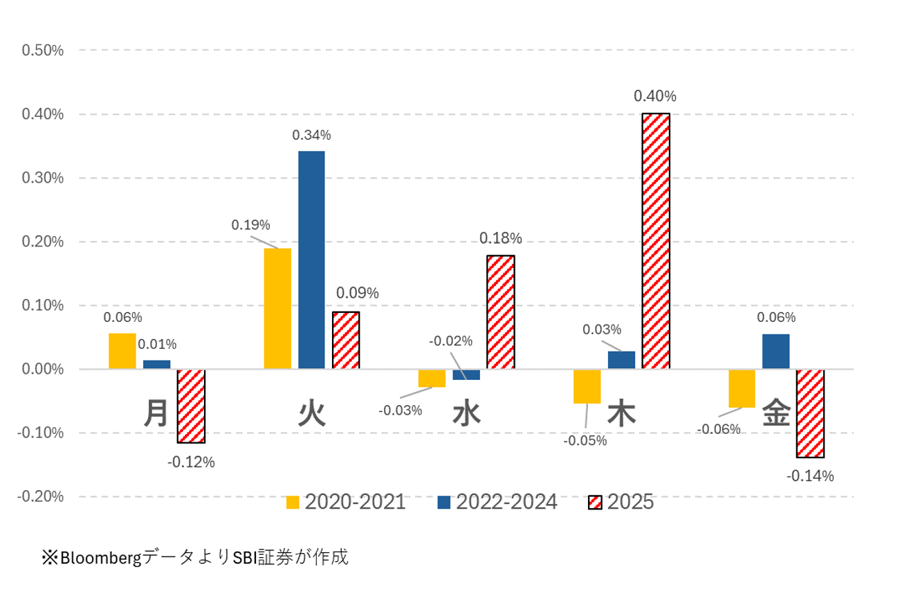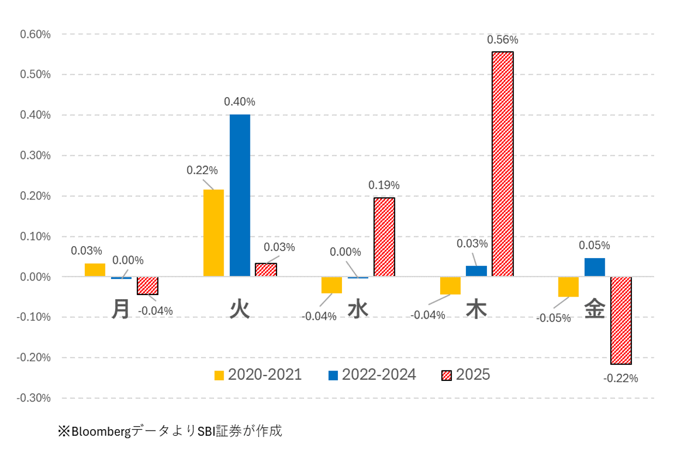 ところが2025年、パターンがガラッと変わりました。火曜日に上がるパターンは消え、水曜に0.19%上昇、木曜に0.56%上昇とシフトしました。一方、金曜は0.22%下落。つまり「水・木で上げて、金曜にスピード調整」という流れです。