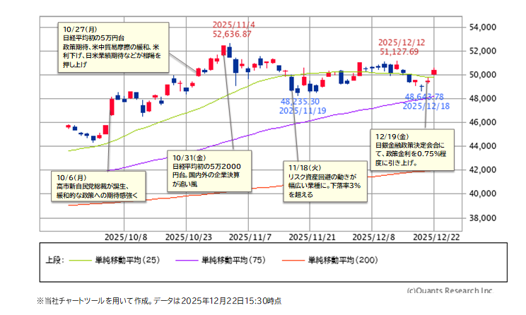 12/22の日経平均株価は大幅に続伸し、ついに5万円の大台を回復しました。FOMC(米連邦公開市場委員会)や日銀金融政策決定会合を無難に通過したことで、年末ラリーへの期待感が一段と高まっています。ただし、クリスマス休暇を控えて海外投資家が取引を控える傾向も強まる時期であり、方向感が出にくい環境でもあります。そのため、市場参加者の関心は、むしろ「2026年」へと向かいやすくなっていると考えられます。